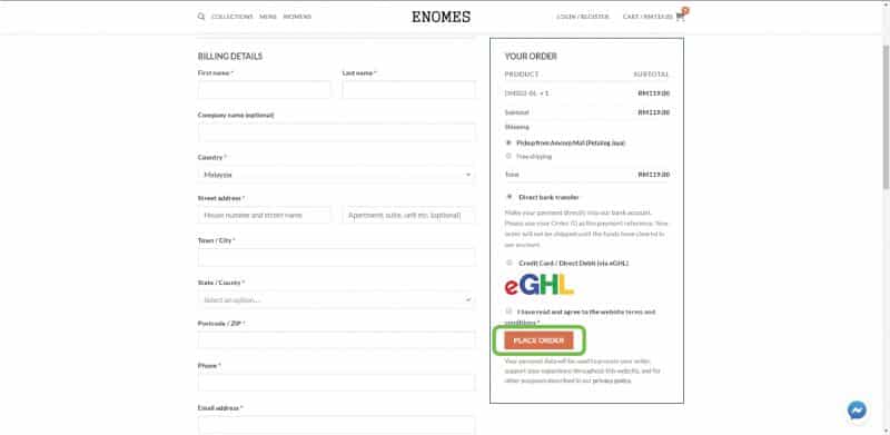 By clicking on the “PROCEED TO CHECKOUT” tab, it will lead you to the billing and delivery page. You will need to FILL IN YOUR DETAILS and choose your type of PAYMENT before clicking on the “PLACE ORDER” tab.